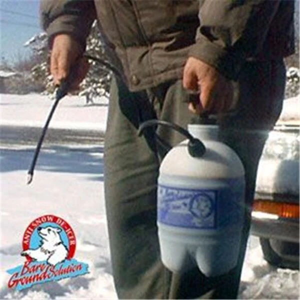 Product description: Includes: One gallon capacity all purpose hand pressurized sprayer One gallon of Bare Ground anti snow/de-ice solution. Solution: Environmentally safe and biodegradable Virtually non-corrosive Safe on all surfaces Safe for delicate trees and shrubs Safe for roofs and eaves Better viscosity for smoother spraying Odor free so no unpleasant smell New amber color for cleaner application Bare Ground Solution Deluxe One Gallon Sprayer System – Model #BGDS-1