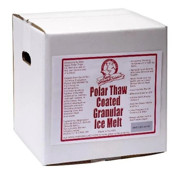 Bare Ground box of coated granular blend comes in a convenient box with cutout carry handles. The Bare Ground coated granular blend is a combination of powerful ice melters and a corn derived corrosion inhibitor. The granular blend starts with a base of sodium chloride which is coated with liquid magnesium chloride and a corn based inhibitor. The resulting product is about 40% less corrosive than a standard salt ice melter and acts more quickly and at lower temperatures. Coated blend is easy to carry. Coated blend has no messy plastic bags to tear and break. Coated blend contains 40 Lbs. of coated granular blended salt which is fast acting and lower in corrosion. Bare ground uses a special agriculturally derived by-product for corrosion inhibiting. Bare Ground actually coats each granule with magnesium chloride to make it fast acting. Unique blend of magnesium chloride, sodium chloride and corn derived corrosion inhbitor. Stores neatly without hassle. Gentler on the environment and infra-structure. Lowest effective temperature (F) : -20. Depth: 12″. Height: 12″. Width: 12″.
