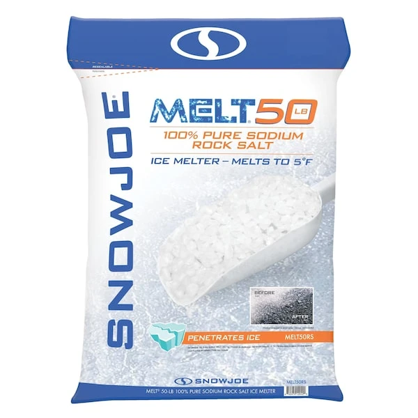 THE NICER DE-ICER! This long-lasting, all-natural, 50-lb MELT 100% Pure Sodium Rock Salt effectively melts ice and snow on contact, even at temperatures as low as 5DegF. It goes to work immediately to penetrate snow and ice layers by lowering the freezing temperature and creating a brine solution that can easily be shoveled away. Plus, it provides safer traction along icy paths thanks to large granules with a coarse texture. Ultra-easy to dispense, too – just distribute by hand or use with a salt spreader for efficient spreading. The bag is resealable for easy storage and extended shelf-life.