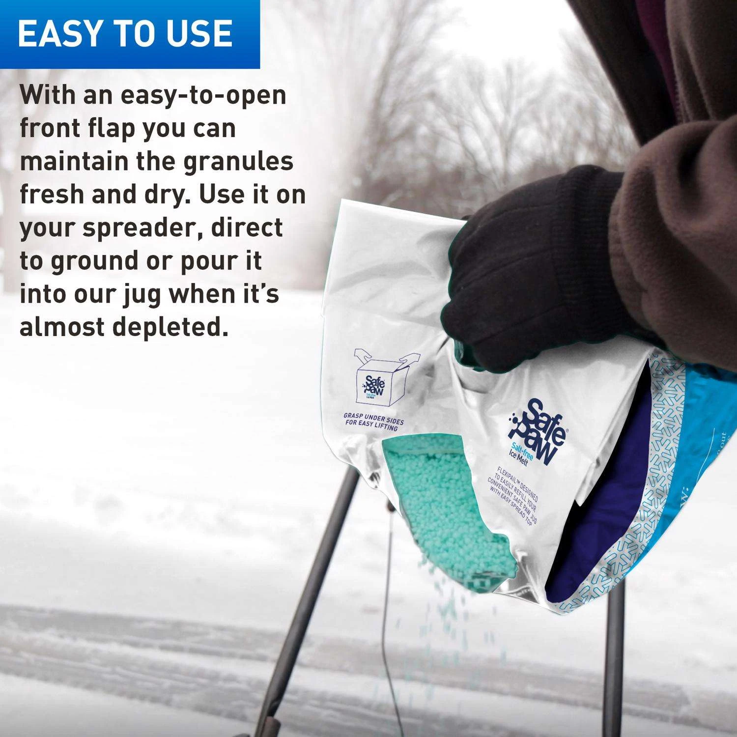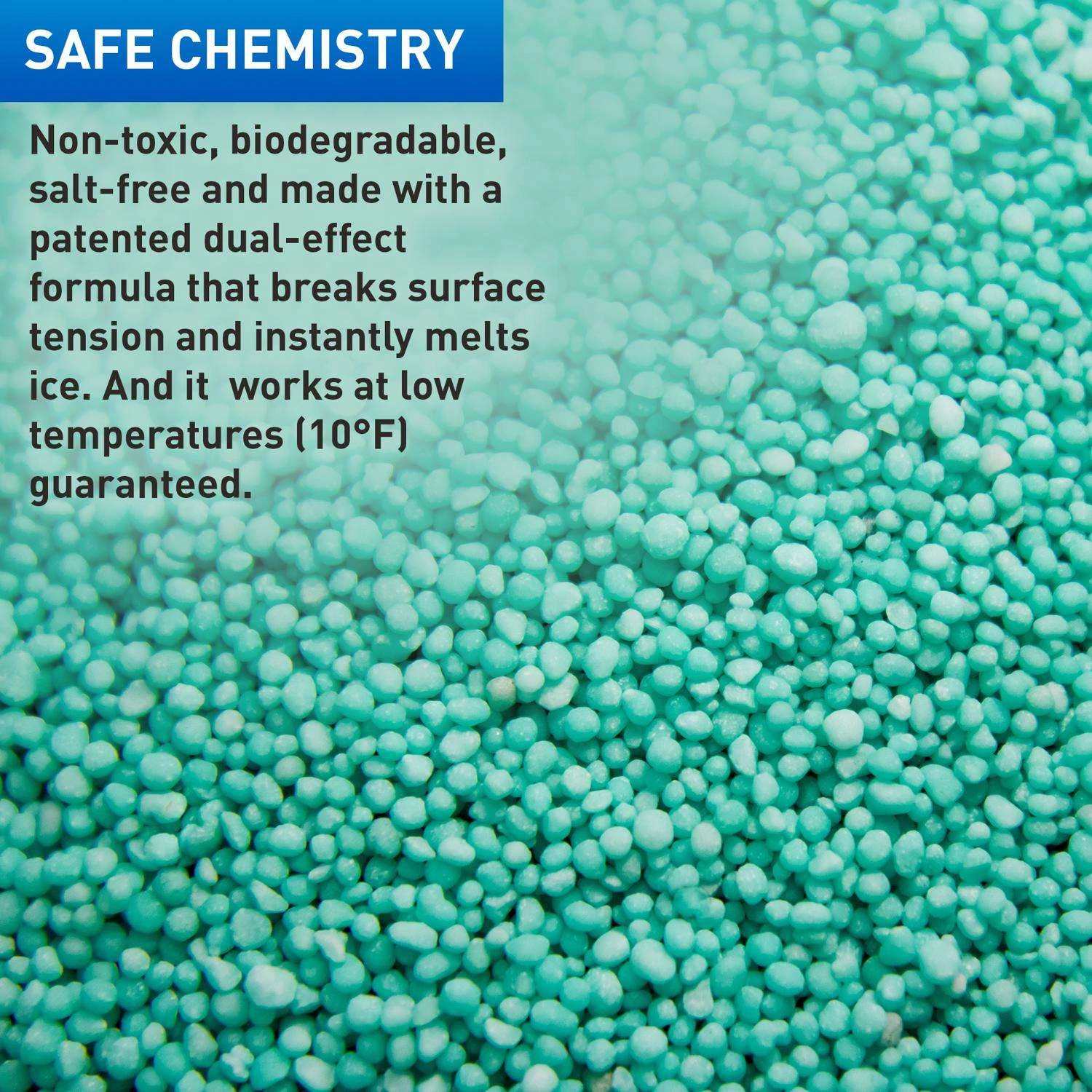 The Original and the no.1 Pet and Child Safe Ice melter for over 20 years. Guaranteed environmentally safe – will not harm waterways and sensitive wetlands. Unused ice melt is good for years with an unlimited shelf life. Safe Paw is a patented dual-effect compound. The liquid component starts melting ice instantly while breaking its surface tension. This allows the crystal core to quickly penetrate and destabilize the ice and speed up the melting process. All this while Safe Paw proprietary traction agent provides slip protection. Safe Paw attracts heat to make it even more effective Endothermic reaction takes advantage of a solar effect. Non-corrosive and non-conductive formula – safe on cured concrete! Pet and kid safe even if ingested Concentrated formula – use 1/2 of what you would use with salt Lasts 72 hours on the surface Salt free, chlorine free, acetate free formula – environmentally safe