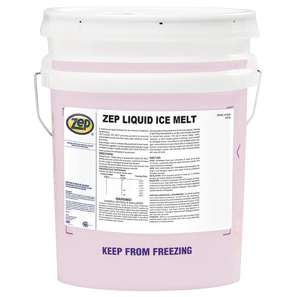 Liquid Ice Melt, 5 gal, Effective Temp. -13 Degrees F, Net Weight 5 gal, Package Type Pail, Ice Melt Color Pink, Contains 2-Diol,2-Nitrilotriethanol,Alpha-Phenyl-Omega-Hydroxy, Ethane-1, Phosphat
